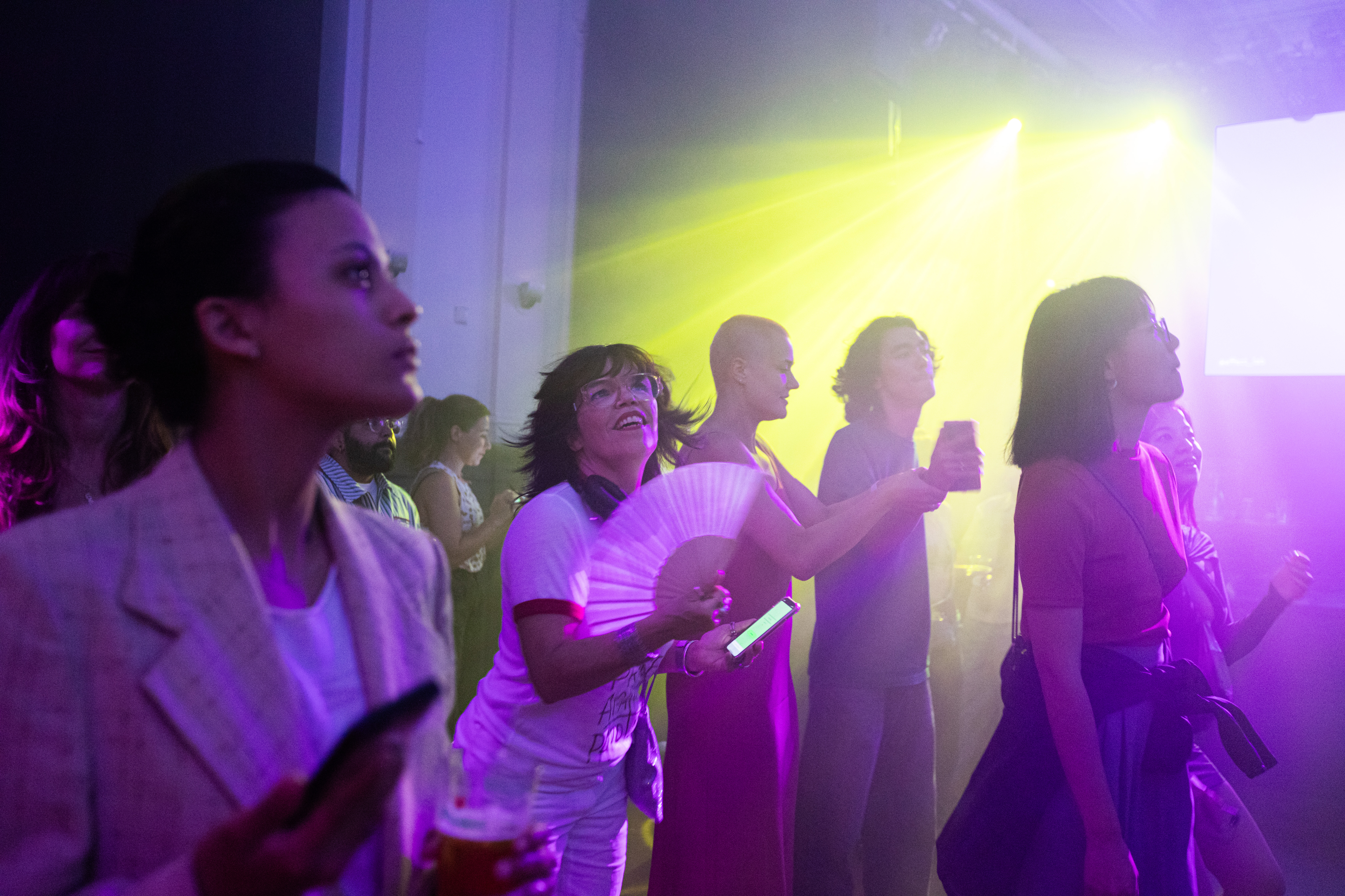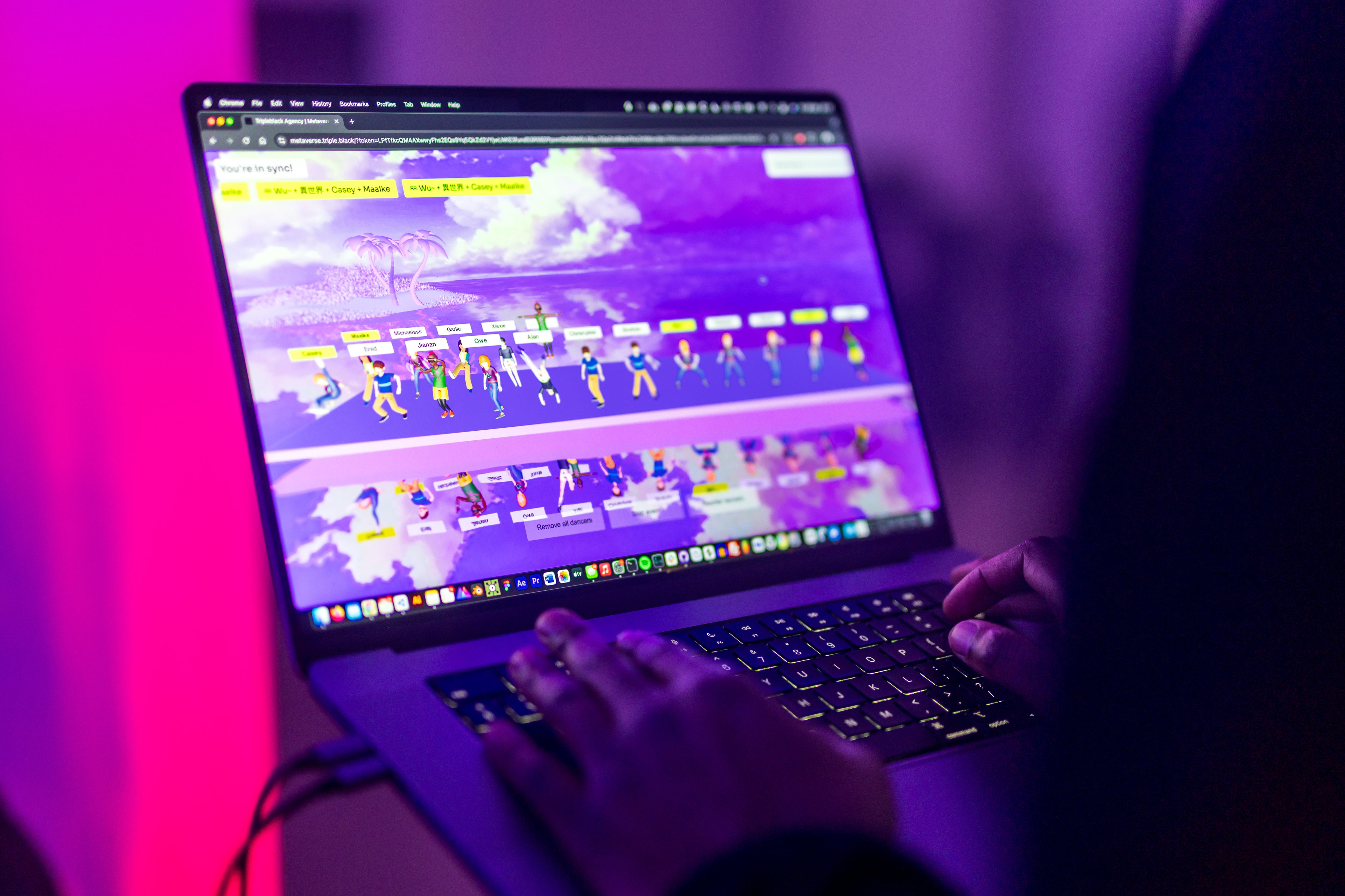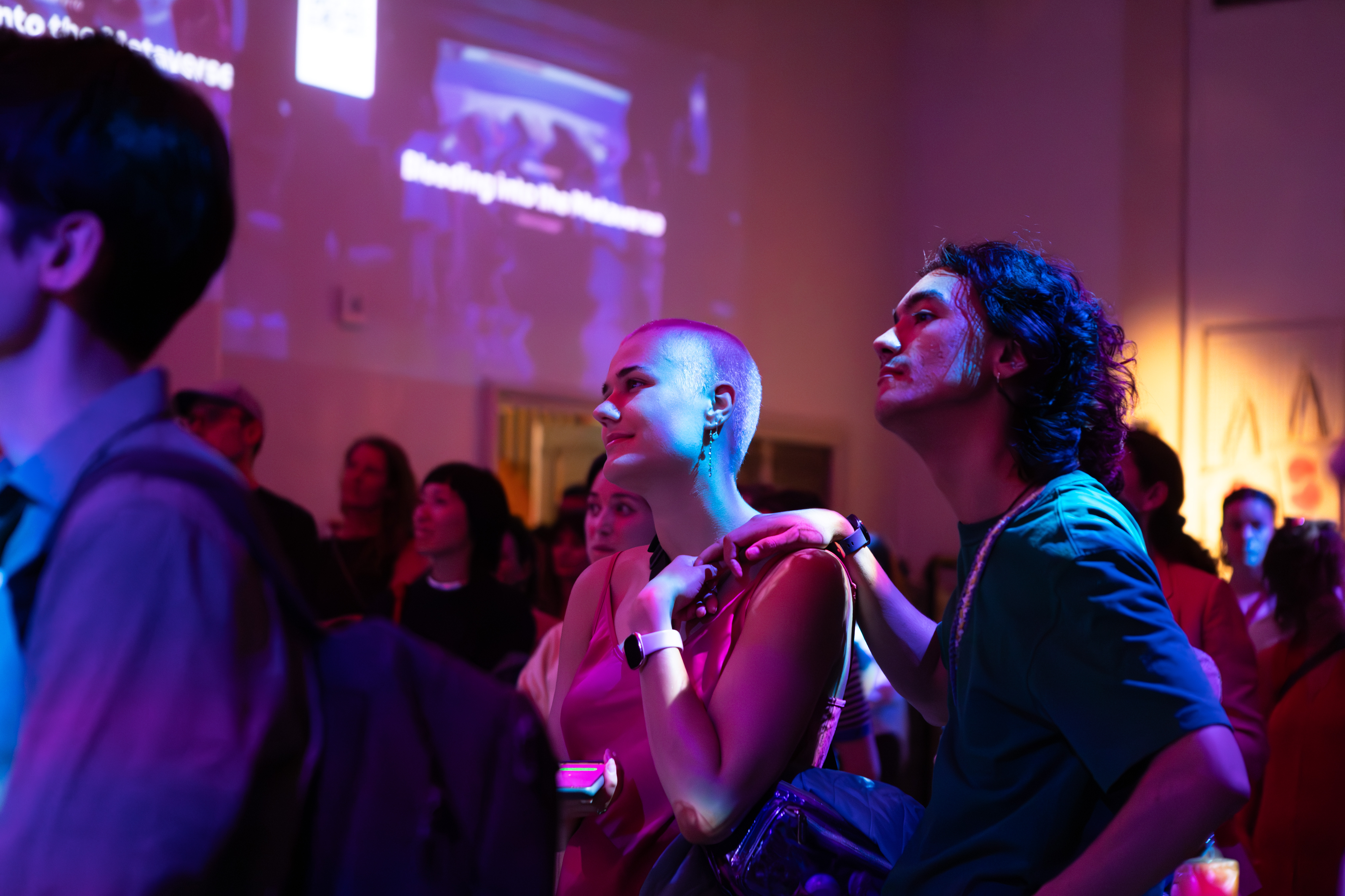 The work deploys a metaverse-like environment, designed and built by Babusi Nyoni and projected onto the surrounding walls, filled with bleeding dancing avatars. Each human dancer is paired with a virtual dancer / avatar via an app which uses the built-in gyroscopes of participants’ phones to measure the movements of dancers on the dancefloor. The result is a paired rhythmic attunement between avatars and humans and an explosion of movement.