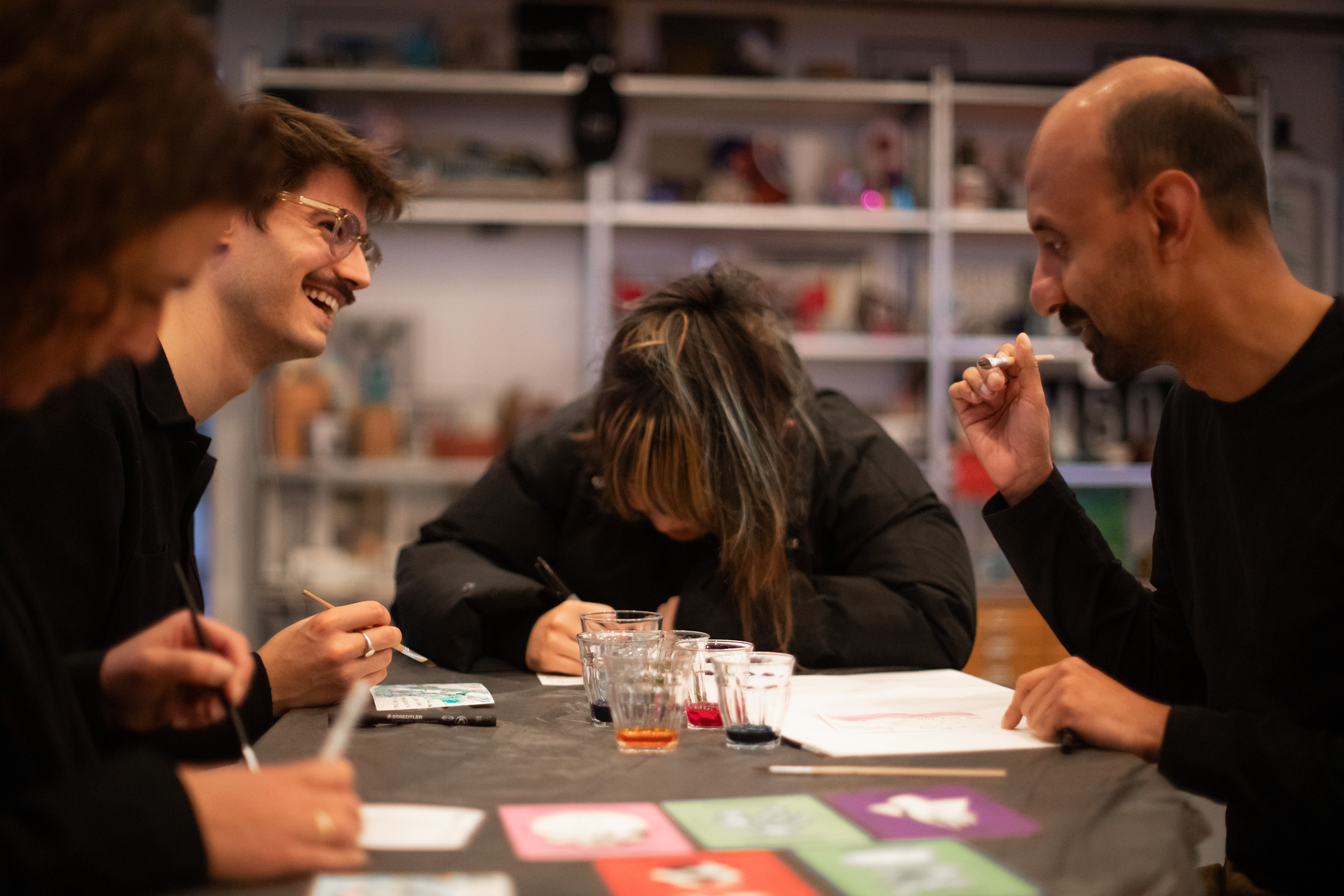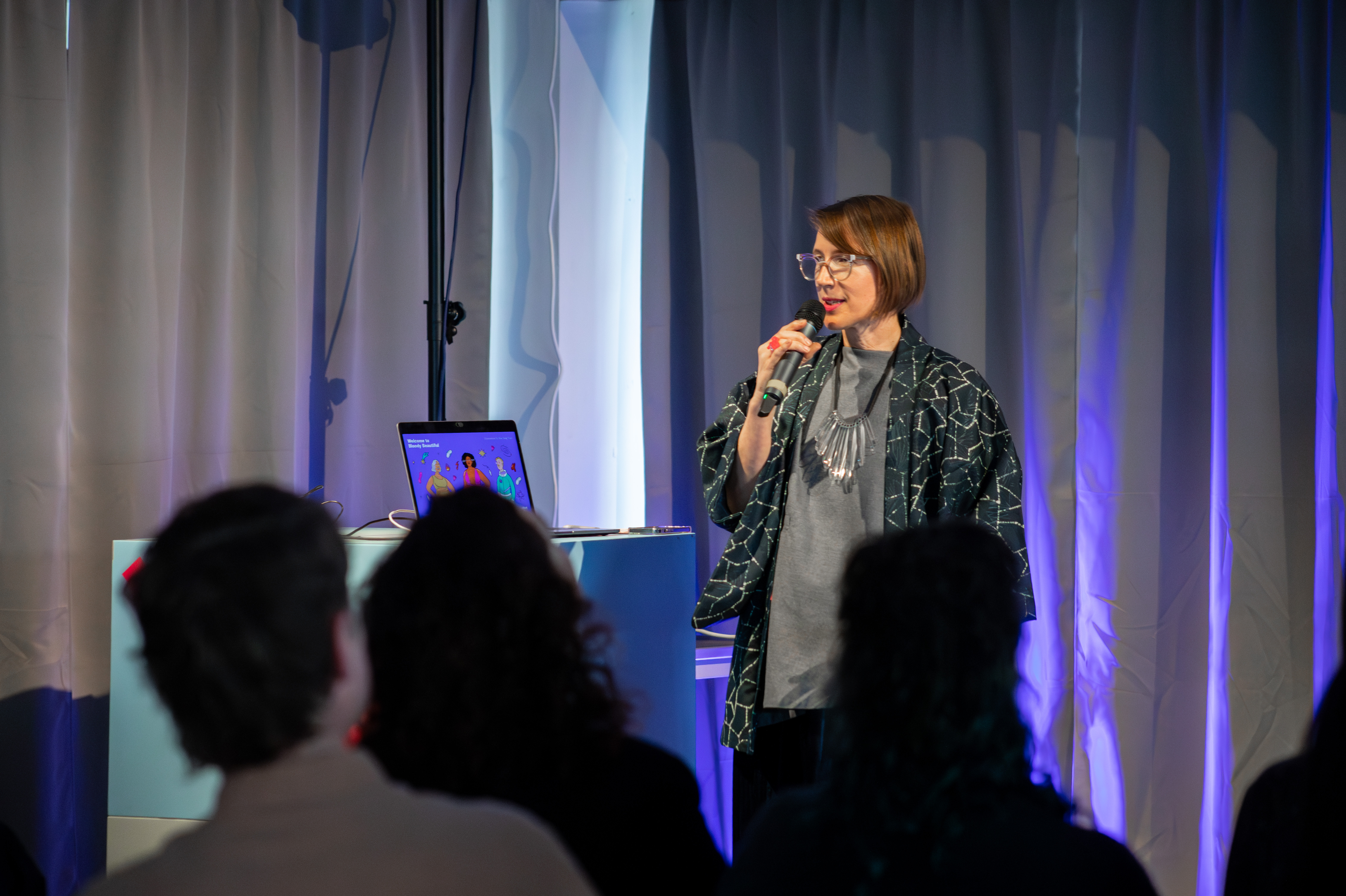 We turned our attention back to Earth. In an interactive painting session, the participants reflected on designs that can make our planet more inclusive for menstruators and menopausal people. This session was inspired by Sovjet space architect Galina Balashova. She was the only woman in a team of male engineers, and with delicate aquarelles she designed with the human in mind, using colors-coding to create a sense of direction in micro gravity.